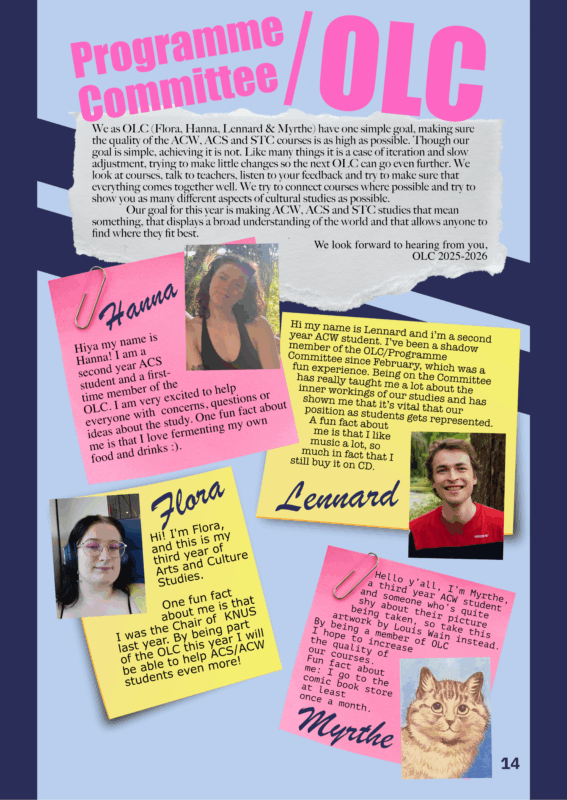 Every study has its own Programme Committee (OLC), including Arts & Culture Studies, Algemene Cultuurwetenschappen and Samenleving Taal & Cultuur. The OLC exists out of staff members and students from our studies and ensures that the quality of the programme is maintained. They do so in several ways, for instance: advising about education and examination regulations and how these are put into practice; by discussing the evaluations given on courses by students and by advising the programme coordinator about anything related to the study itself and education in general.